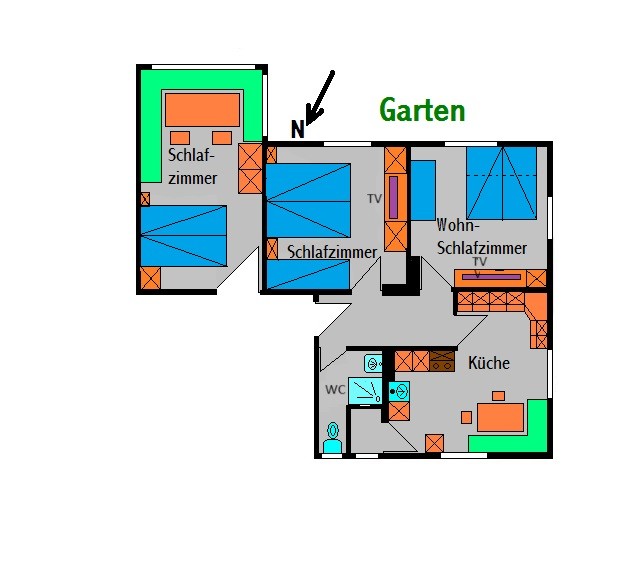 Geeignet für 2-6 Erwachsene: bestehend aus zwei Schlafzimmern, einem Wohnschlafzimmer, einer vollausgestatteten Küche mit Sitzbereich und einem Badezimmer ausgestattet mit: Flat-TV mit Satelittenempfang und..