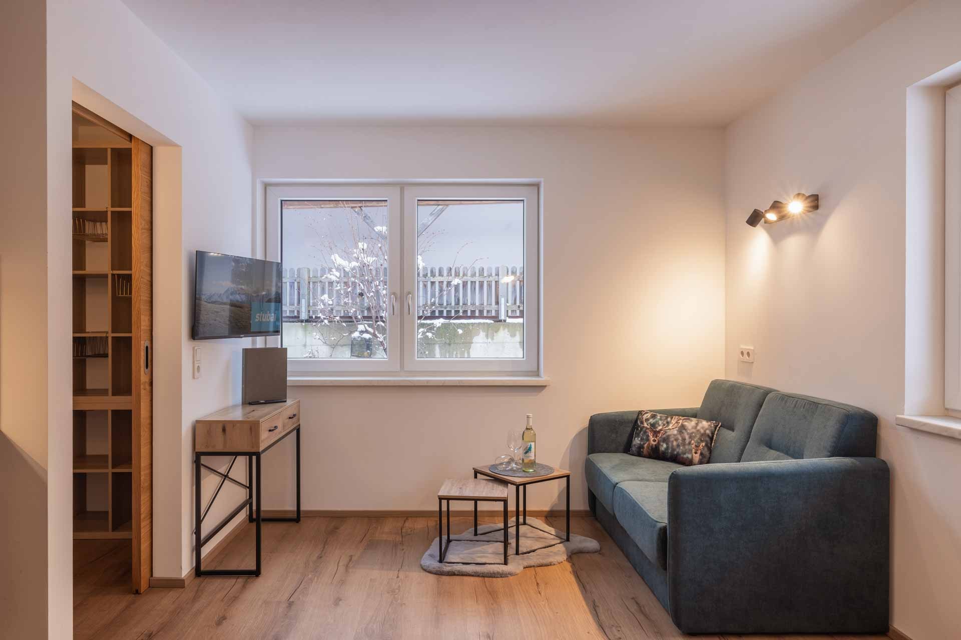 Im selben Raum befindet sich der Wohnbereich mit Smart-TV und Ausziehcouch. Darauf können problemlos 1-2 Kinder oder 1 Erwachsener schlafen.