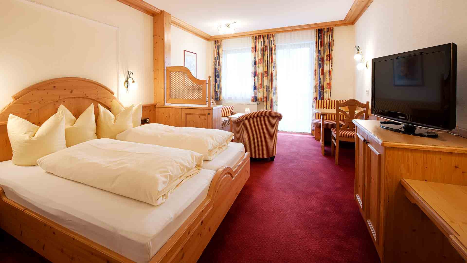 Gemütliches Doppelzimmer mit Sitzecke, Dusche und Toilette, Internetanschluss, Radio, SAT-TV, Telefon, Safe, Föhn und Balkon mit bezauberndem Blick auf die Stubaier Alpen. Alle unsere Zimmer und Suiten im 4-Sterne-Ho..