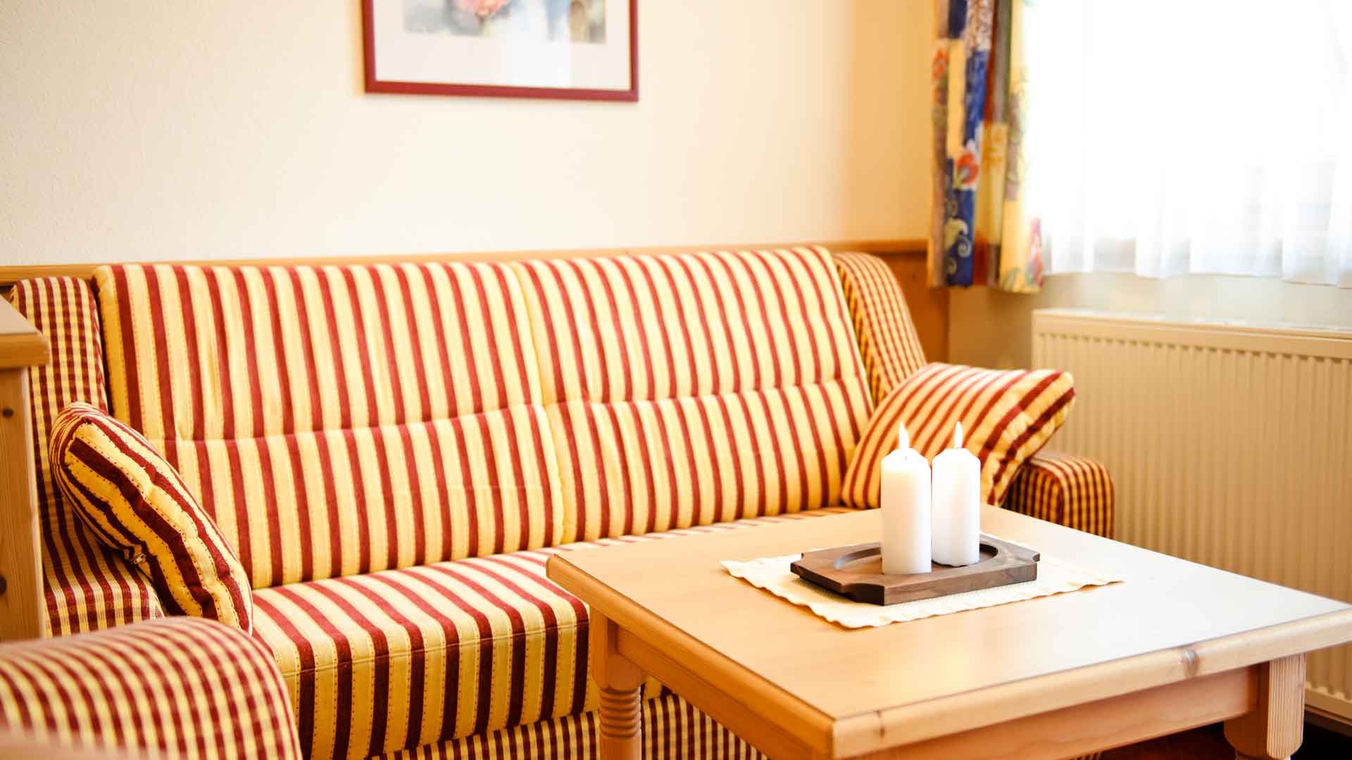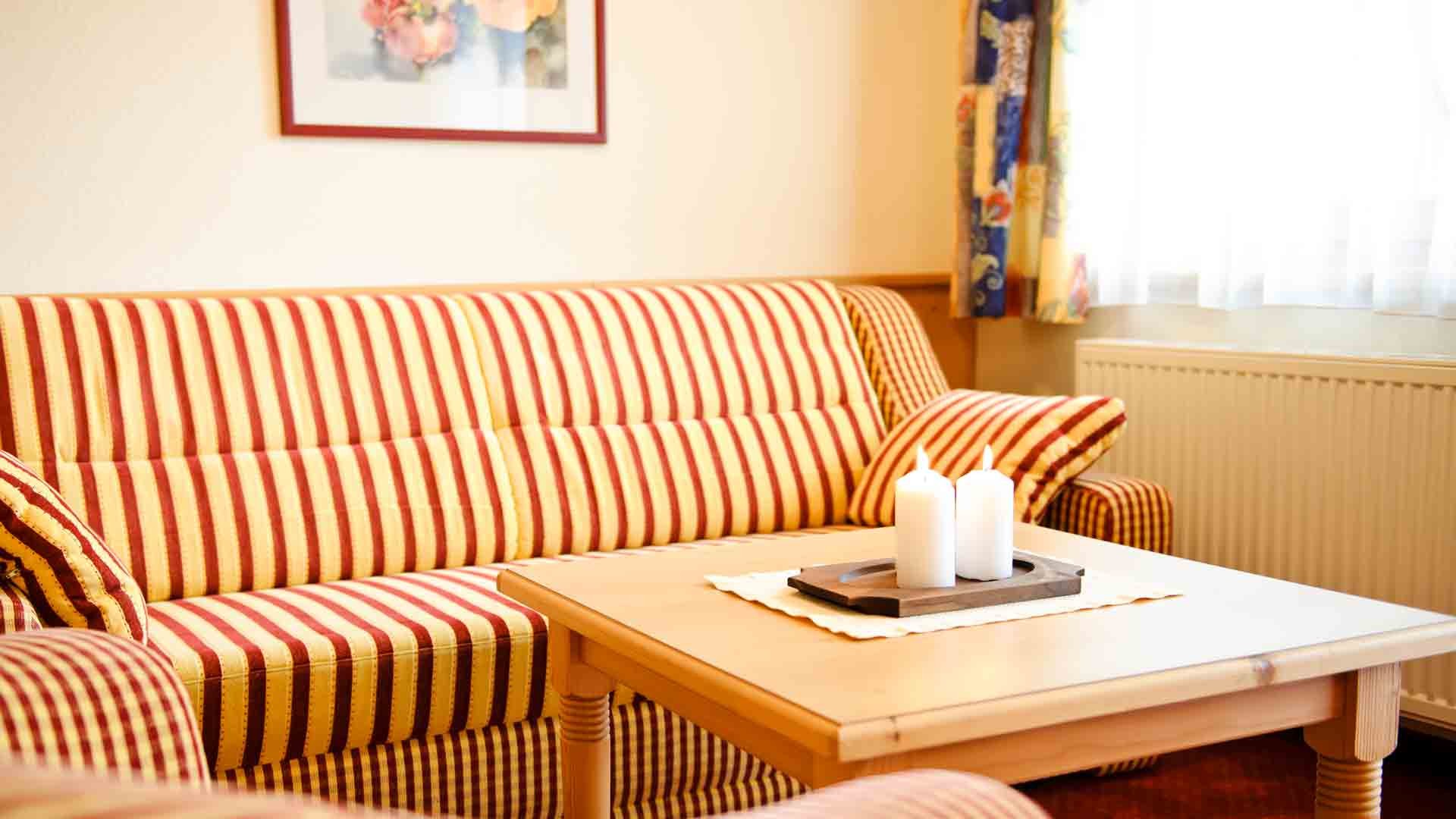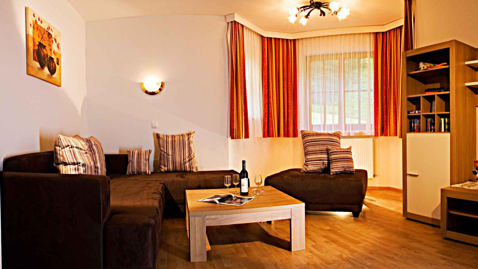Geräumige Suite (60 qm) mit Wohnstube, abgeteiltem Schlafraum, Kochnische, Dusche und Badewanne, Toilette getrennt, Internetanschluss, Radio, SAT-TV, Telefon, Safe, Föhn und Balkon mit herrlichem Blick auf den Volderaue..
