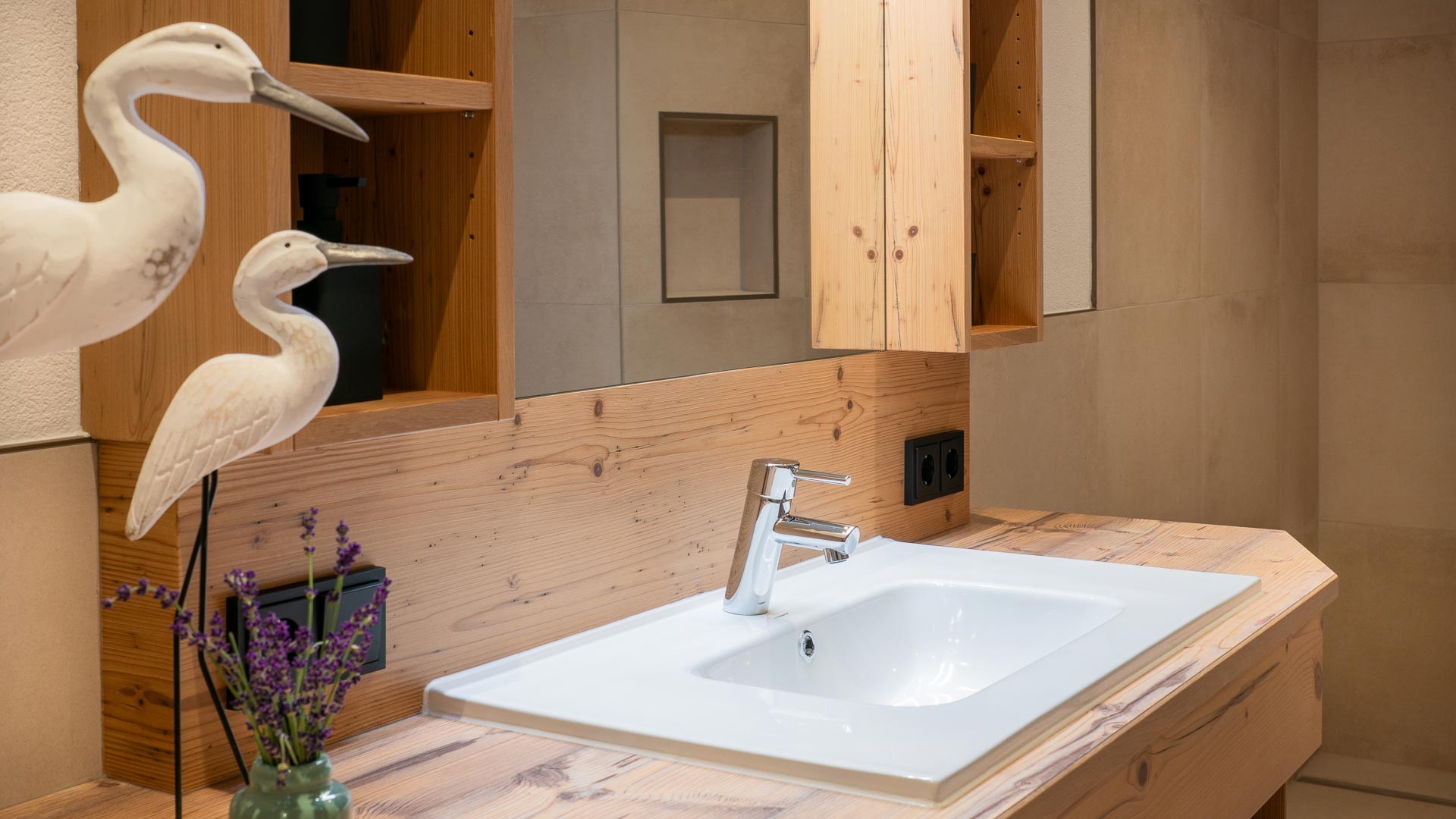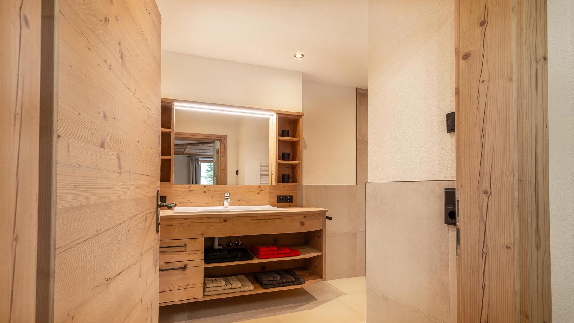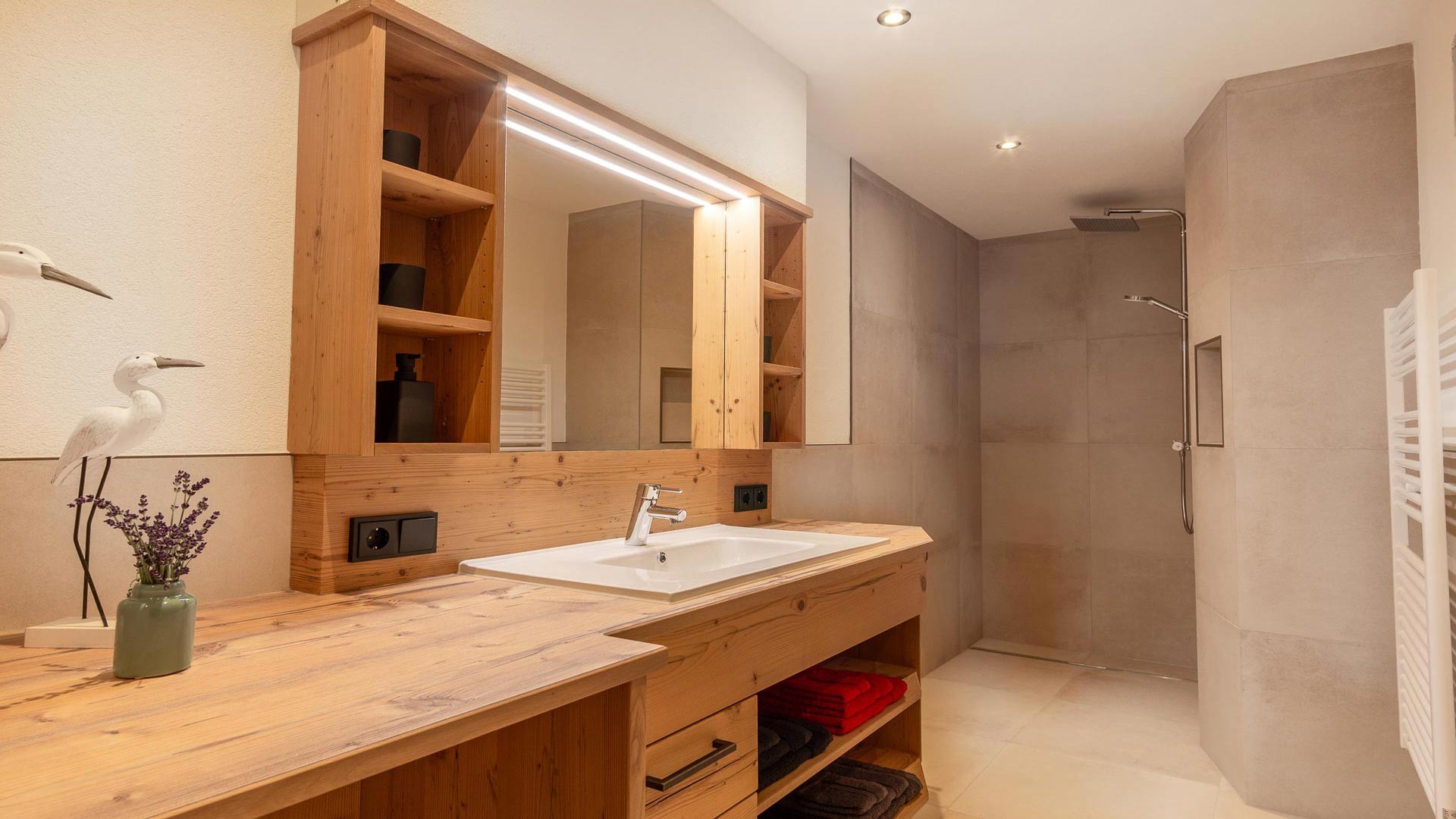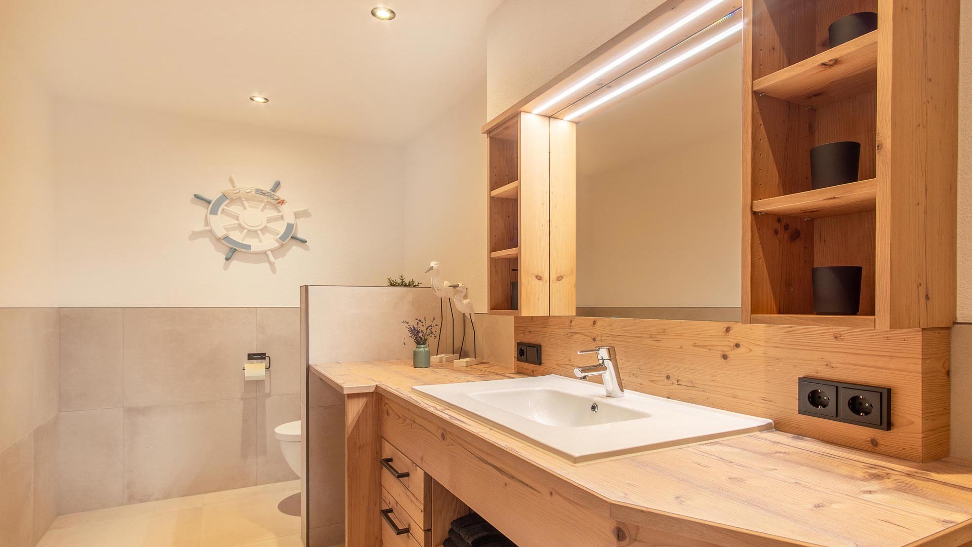 Das mit großzügiger Dusche und Wc ausgestattete Badezimmer ladet nach einem ereignisreichen Tag zum Entspannen und Verweilen ein.